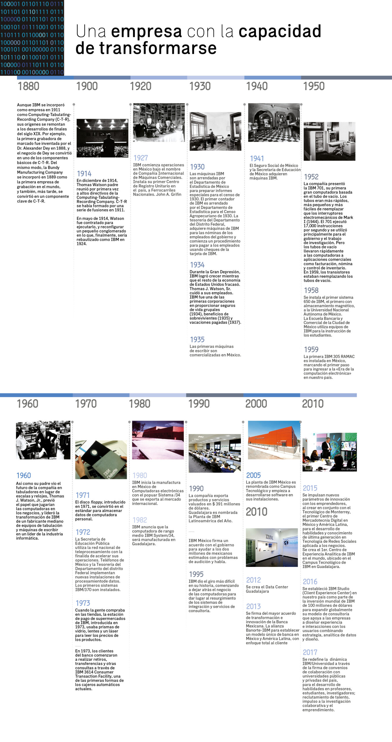 Desde el principio, la tecnología de IBM permitió el primer censo de población en México y la creación de las primeras tarjetas de crédito en los años 50. Hemos acumulado hitos en la historia del país porque nuestro trabajo ha sido acompañar a las empresas en la evolución tecnológica que dicta el paso del tiempo.