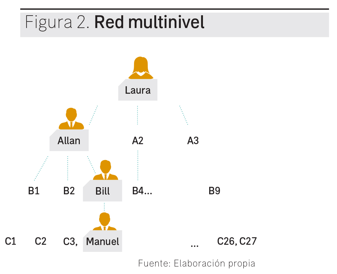 A juicio de Kishel, G. y Kishel, P. (1991) la venta multinivel es «un método de venta en el que los consumidores tienen la opción de convertirse en distribuidores del producto, a través del desarrollo de líneas o niveles de distribución más bajos que ellos; todos los niveles reciben beneficios de sus niveles inferiores». También resulta de interés la definición de Clothier (1991), para quien se trata de «un método para vender mercancías directamente a los consumidores, por medio de una red desarrollada por distribuidores independientes que introducen más distribuidores, generándose los ingresos por los beneficios minoristas y mayoristas, suplementados por bonificaciones basadas en las ventas totales del grupo formado por el distribuidor». De tal modo, más que en la propia reventa del producto a cargo del individuo, el multinivel consiste en el reclutamiento eficaz y eficiente de personas que se integren al esquema de distribución, siendo éste el elemento imprescindible y principal para el éxito del sistema.